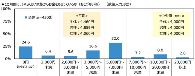 全回答者(4,500名)に、1カ月間に、いくらくらい家族からお金をもらっているか(おこづかい等)聞いたところ、「0円(もらっていない)」(24.6%)や「3,000円~5,000円未満」(16.6%)、「5,000円~7,000円未満」(32.0%)に回答が分かれ、平均は4,460円でした。
