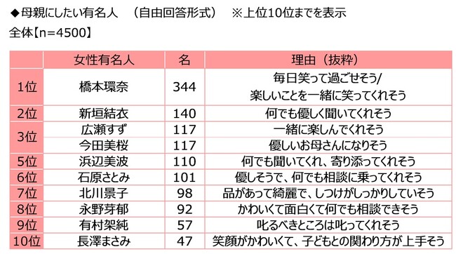 有名人を挙げた理由をみると、1位の「橋本環奈さん」では「毎日笑って過ごせそう」や「楽しいことを一緒に笑ってくれそう」、2位の「新垣結衣さん」では「何でも優しく聞いてくれそう」、3位の「広瀬すずさん」では「一緒に楽しんでくれそう」、「今田美桜さん」では「優しいお母さんになりそう」といった回答がありました。