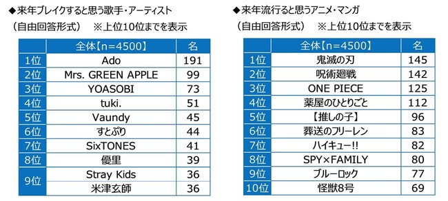 また、来年流行ると思うアニメ・マンガを聞いたところ、1位「鬼滅の刃」(145名)、2位「呪術廻戦」(142名)、3位「ONE PIECE」(125名)、4位「薬屋のひとりごと」(112名)、5位「【推しの子】」(96名)となりました。