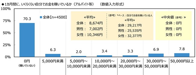 1カ月間に、いくらくらい自分でお金を稼いでいるか(アルバイト等)聞いたところ、「0円(稼いでいない)」(70.3%)が特に高くなり、「5,000円未満」(6.3%)や「30,000円~50,000円未満」(6.9%)、「50,000円以上」(7.8%)にも回答がみられ、平均は8,674円でした。