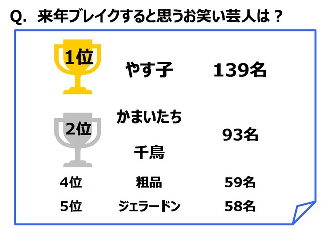 来年ブレイクすると思うお笑い芸人を聞いたところ、元自衛隊員で自身の経歴を活かしたネタが人気の「やす子さん」(139名)が1位となり、2位「かまいたち」「千鳥」(いずれも93名)、4位「粗品さん」(59名)、5位「ジェラードン」(58名)と続きました。