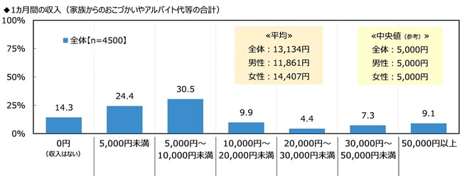 ここで、1カ月間の収入(家族からのおこづかいやアルバイト代等の合計)をみると、「5,000円未満」(24.4%)や「5,000円~10,000円未満」(30.5%)に回答が集まり、平均は13,134円でした。