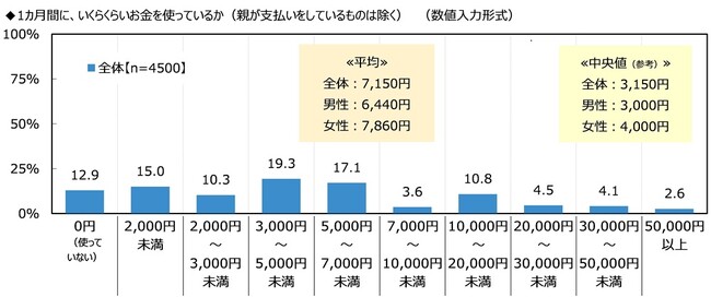 他方、1カ月間に、いくらくらいお金を使っているか聞いたところ、「2,000円未満」(15.0%)や「3,000円~5,000円未満」(19.3%)、「5,000円~7,000円未満」(17.1%)などに回答が分かれ、平均は7,150円でした。