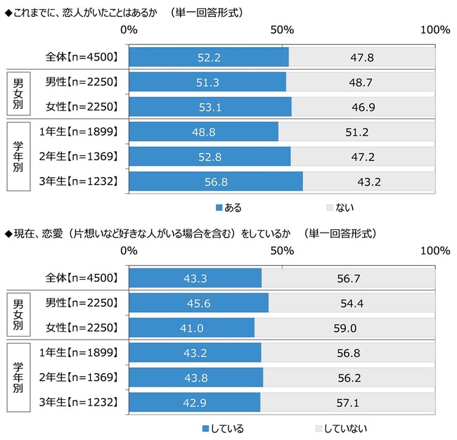 「現在、恋愛をしている」 43%、「現在、恋人がいる」 18%