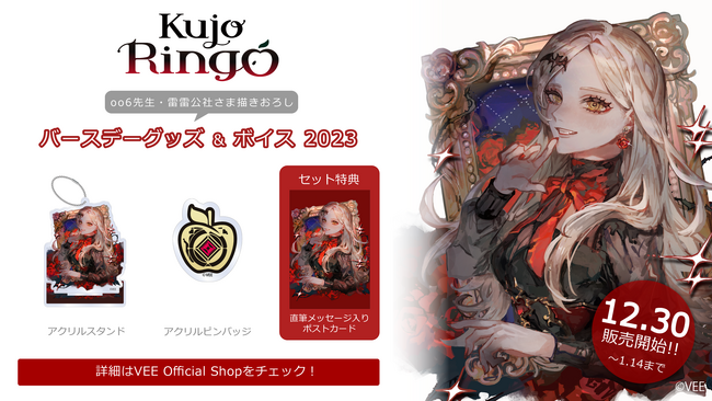 本日・12月30日に誕生日を迎えた九条林檎のバースデーグッズの詳細を公開するとともに、公式オンラインショップ「VEE Official Shop」にて受注販売を開始しました。
