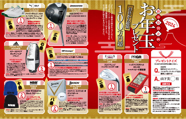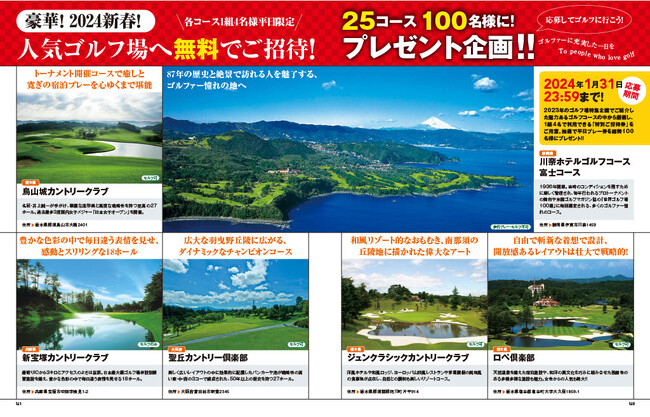 新春2大プレゼントは、総額100万円超えのクラブ、ボールなどのグッズのほか、人気ゴルフ場に25コース100名様を招待する大型企画となっています。