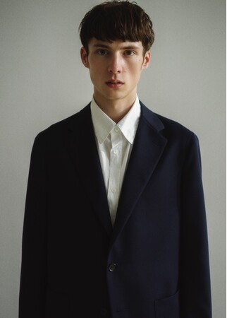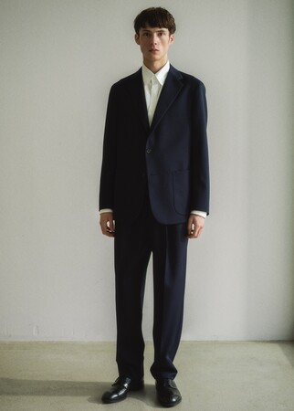ボックスシルエットのジャケットにサイドアジャスターのスラックスを組み合わせ、