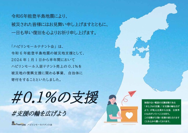 福井県福井市中央にあります「ハピリン」に入居するテナントで組織する「ハピリンモールテナント会」(会長:斎藤敏幸)は、令和6年能登半島地震の被災地支援として、同じくハピリンモールテナント会に所属する株式会社大津屋(代表取締役:小川尚樹)の「#0.1%の支援」「#支援の輪を広げよう」の取り組みに賛同し、2024年1月1日から2024年6月30日の半年間において下記賛同店舗の売上の0.1%を被災地の復興支援に関わる事業、自治体に寄付をすることといたしました。また、ハピリン商業床運営会社「ハピリンモール株式会社」(代表取締役:山田和徳)も、テナント会に賛同し、テナント会を通じて、売り上げの一部を復興支援として寄付をすることといたしました。■実施内容