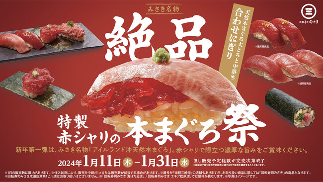 株式会社 京樽(本社:東京都中央区、代表取締役社長:堀江 陽)が展開する「回転寿司みさき(旧:海鮮三崎港)」は、1月11日(木)より、“特製赤シャリ”で旨みがさらに際立つアイルランド沖天然本まぐろの寿司を楽しめる『絶品 特製赤シャリの本まぐろ祭』を期間限定で開催いたします。