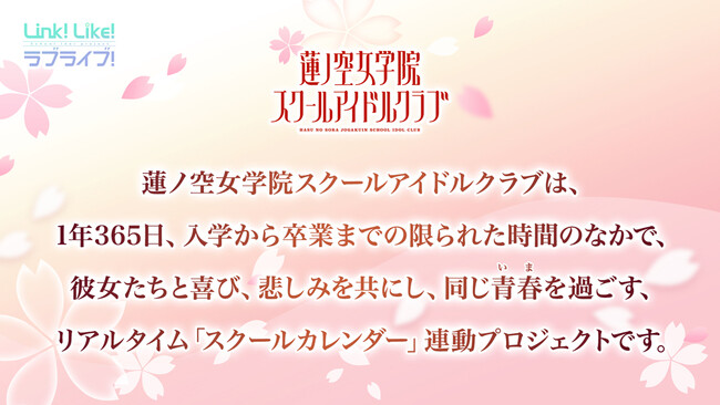 蓮ノ空女学院スクールアイドルクラブは、1年365日、入学から卒業までの限られた時間のなかで、彼女たちと喜び、悲しみを共にし、同じ青春を過ごす、リアルタイム「スクールカレンダー」連動プロジェクトです。