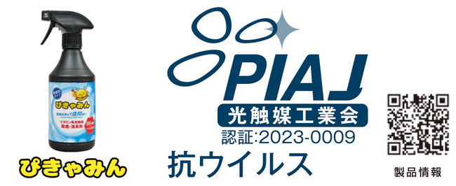 ユシロ化学工業株式会社(代表取締役社長:有坂昌規、以下「ユシロ化学」)は、ユシロ化学の光触媒型除菌消臭剤「ぴきゃみん」において、可視光による抗ウイルス性能が認められ、有機分子からなる光触媒製品では初めて光触媒工業会のPIAJ製品認証を取得しました。