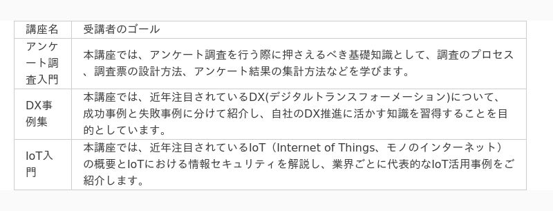 今回新たに公開した「アンケート調査入門」は、DXにおけるデータ活用の重要性を踏まえ、アンケート調査を顧客理解のための有効なツールとして紹介します。具体的には調査票の設計方法や集計方法など、アンケートの基本知識を学べます。また「DX事例集」はDXの成功・失敗パターンを研究し、それらを自社のDX戦略策定に生かすヒントを提供する講座です。「IoT入門」では、データ収集のための重要な技術の一つであるIoTに焦点を当て、IoTの基本知識やセキュリティ上の注意点を学ぶことで、企業のDX推進における選択肢を広げることが狙いとなります。業界別の代表的なIoT活用事例についても解説しています。