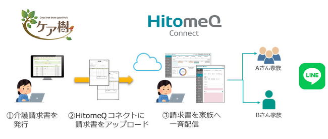 今回の連携で、ケア樹で発行した介護請求書を、HitomeQ コネクトを通して利用者家族へ直接送付できるようになり、請求書送付の封入作業が不要となるのに加えて、時間と印刷・郵送コストの削減を行うことができます。なお、コニカミノルタのクラウド型介護記録請求システム「HitomeQ ツリー」とHitomeQ コネクトの連携によっても、同様のサービスを提供します。