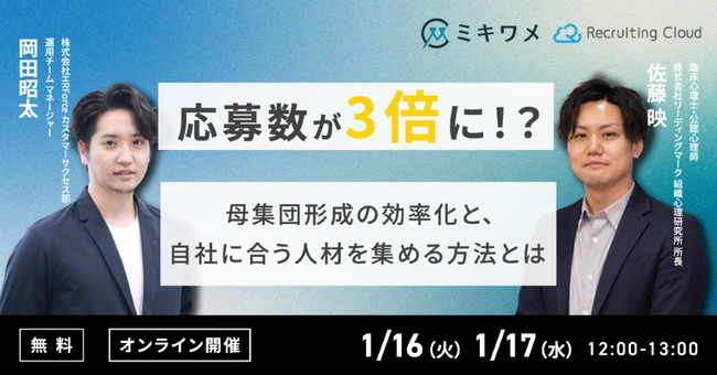 Personality Techを通じたHR事業「ミキワメ」を提供する株式会社リーディングマーク(本社:東京都港区、代表取締役社長:飯田 悠司)は、求人広告運用ツール「Recruiting Cloud」を提供する株式会社 HR Force(本社:東京都千代田区、代表取締役社長:村田 泰子氏)と2024年1月16、17日にて、「母集団形成の効率化と質の向上」にまつわるオンラインセミナーを開催します。