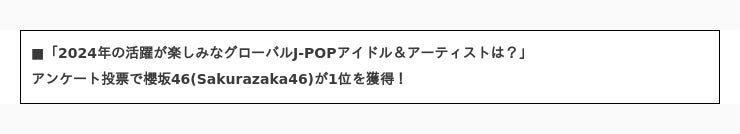 2023年12月27日(水)から2024年1月3(水)まで『IDOL CHAMP』アプリで実施した無料アンケート投票「2024年の活躍が楽しみなグローバルJ-POPアイドル&アーティストは?」において、櫻坂46(Sakurazaka46)が1位を獲得しました。