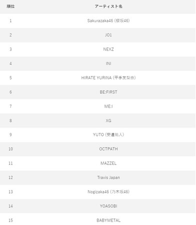 Ado、Aimer、Aimyon (あいみょん)、ano、ATARASHII GAKKO! (新しい学校のリーダーズ)、BABYMETAL、BALLISTIK BOYZ、BE:FIRST、CHAI、Chanmina (ちゃんみな)、Cho Tokimeki Sendenbu (超ときめき(ハート)宣伝部)、DXTEEN、Eve、FRUITS ZIPPER、HIRATE YURINA (平手友梨奈)、imase、INI、JO1、MAZZEL、ME:I、MOONCHILD、NEXZ、NOA、Nogizaka46 (乃木坂46)、OCTPATH、ONE N' ONLY、Quadlips、Sakurazaka46 (櫻坂46)、Travis Japan、WEDNESDAY CAMPANELLA (水曜日のカンパネラ)、XG、YOASOBI、YUTO (安達祐人)、YUURI (優里)、=LOVE