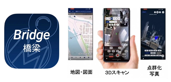 マプリィ・ブリッジはiOS mapryの地図機能をベースに、地図上で登録した橋梁の図面(損傷図、平面図、立面図等)に、3Dスキャナー機能で撮影した点群、及びスマートフォンのカメラによって撮影された写真を関連づけて保存・表示できるスマートフォン向けアプリです。