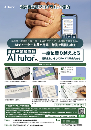 日本PTA全国協議会(会長:後藤 豊郎)、一般社団法人 地域創生応援団(理事長:尾上 浩一)、AwakAppグループ(代表:塩飽 哲生)は業務提携し、学びをできる限り保障し、進級や進学、受験に不利益がでないように、能登半島地震の被災地域の子どもたちへの支援として、デジタル家庭学習アプリ「AIチューター」を3ヶ月間無償で提供することを発表します。(資料のダウンロード)