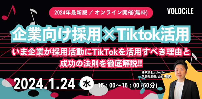 株式会社volocile(本社:東京都港区、代表取締役:山口 辰真、以下「volocile」)は、「いま企業が採用活動にTikTokを活用すべき理由と成功の法則を徹底解説!!」についてのセミナーを1月24日(水)にオンライン開催いたします。