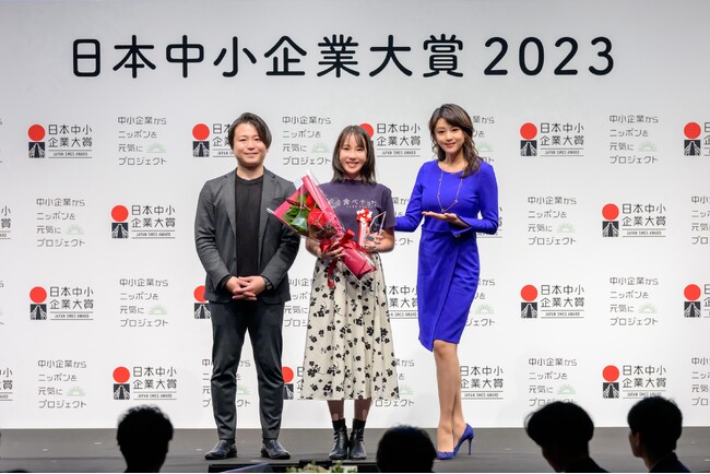 ※プレゼンターの藤原紀香さんと審査員の山下佳介氏(一般社団法人中小企業からニッポンを元気にプロジェクト代表理事)から賞を授与