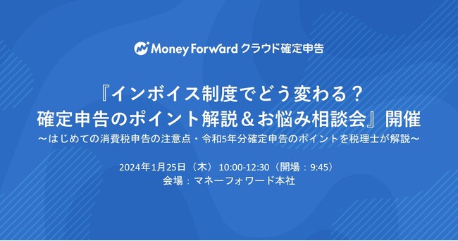 当社は、1月25日(木)に、確定申告セミナー『インボイス制度開始!確定申告のポイント解説&お悩み相談会』を開催します。2023年10月に施行されたインボイス制度の影響で、今回初めて行うユーザーも多い消費税申告のやり方や注意点、令和5年分確定申告のポイントを税理士が解説するほか、確定申告に関する相談を、その場で税理士や『マネーフォワード クラウド確定申告』のカスタマーサポート担当に相談できます。(※本イベントは、定員に達したため受付を終了しました。)