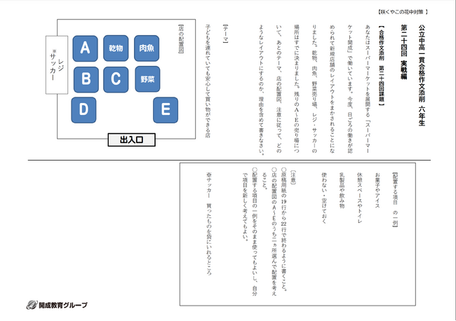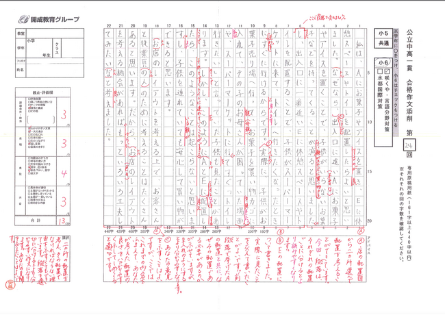 もうひとつは「適性検査」と題された入試科目です。与えられた課題を理解し、的確にとらえ、文章で表現する力を見るためのものです。「大学受験での小論文に近い」と言うと、わかりやすいのではないでしょうか(下図は開成教育グループで用いている作文問題と添削の実例)。