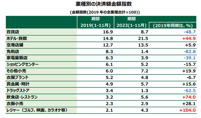 2019年と比較すると、百貨店や家電量販店などの業種で決済金額が減少しています。一方、ホテル・旅館や飲食店・レストランといった観光で利用される業種の決済額が伸長しています。コロナ禍前に注目を集めていた「爆買い」などのキーワードに代表されるモノ消費から、コト消費へと訪日外国人の需要がシフトしてきているとみられます。