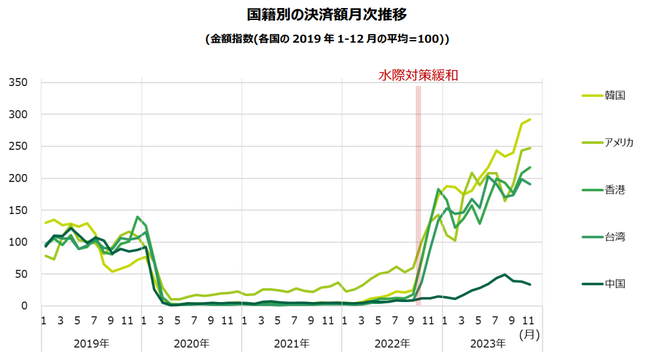 訪日外国人による決済額は、2022年10月の水際対策緩和後に急回復し、2023年の後半にコロナ禍前の2019年の水準に回復しました。2023年は新型コロナウイルスの5類移行や円安による追い風、さらに8月に中国政府による日本への団体旅行解禁といったイベントもあり、引き続き決済金額が伸長しています。