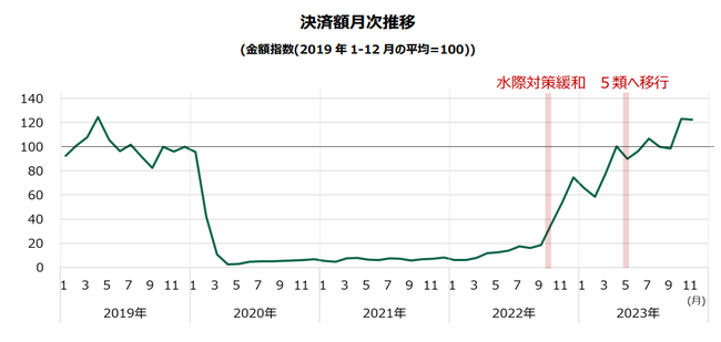2022年10月に入国者や帰国者に対する水際対策が緩和され、2023年5月には新型コロナウイルスの感染症法上の位置づけが5類へ移行されたほか、円安による追い風や、8月の中国政府による日本への団体旅行解禁といったイベントもあり、訪日外国人によるクレジットカードの決済金額は大きく伸長しました。