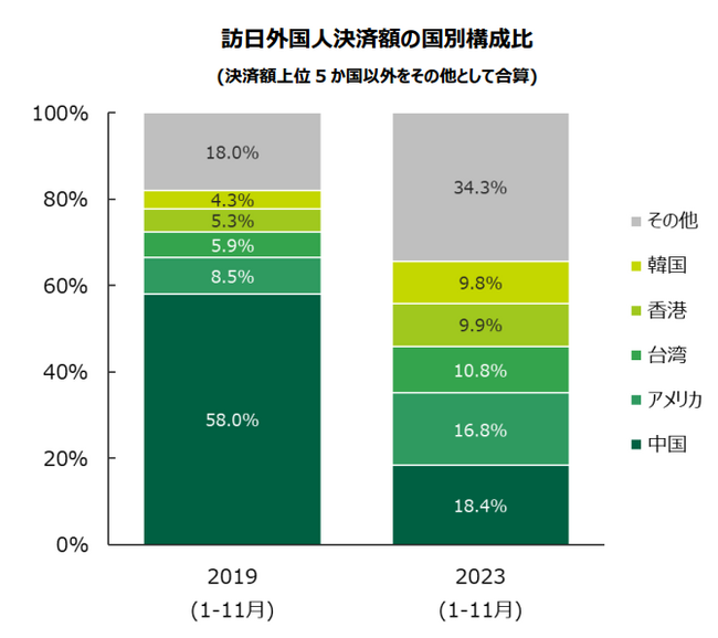 コロナ禍前の2019年には決済額全体の6割程度を中国人観光客が占めていましたが、2023年は2割程度の水準に縮小しました。中国人観光客以外に着目すると、各国コロナ禍前と比較して構成比は伸長傾向にあります。決済額が上位の国を見ると、アメリカや台湾をはじめ、各国の構成比が2倍前後の水準となりました。