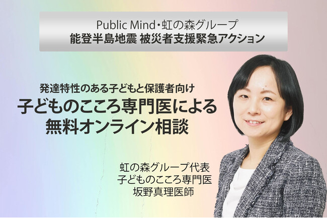 令和6年1月1日に発生した能登半島地震の被災者支援のための緊急アクションとして、発達特性のある子どもと保護者向け「子どものこころ専門医」による無料オンライン相談を1月22日(月)から開始いたします。日本に約500名しかいない「子どものこころ」専門医である坂野真理 医師が代表を務める虹の森グループ(本部:鳥取県倉吉市、イギリス支店)がオンライン相談を行い、社会課題の解決にむけて活動する方々の中間支援団体NPO法人パブリックマインド(本部:東京都中央区、代表:岩崎明彦)が石川県等とのコーディネート業務や広報、無料相談を可能にするための支援を実施いたします。