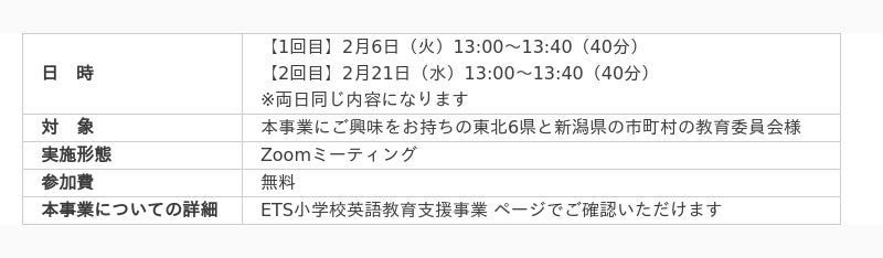 説明会では事業の概要だけでなく、今後の事業の申請の流れやスケジュールについてもご説明させていただきます。詳しくは「ETS小学校英語教育支援事業 説明会」申込ページ をご確認ください。