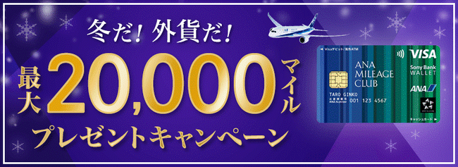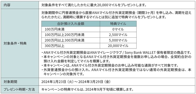 ソニー銀行株式会社(代表取締役社長:南 啓二/本社:東京都千代田区/以下 ソニー銀行)は、全日本空輸株式会社(代表取締役社長:井上 慎一/本社:東京都港区/以下 ANA)と「冬だ!外貨だ!最大20,000マイルプレゼントキャンペーン」を2024年1月23日(火)より実施しますので、お知らせします。