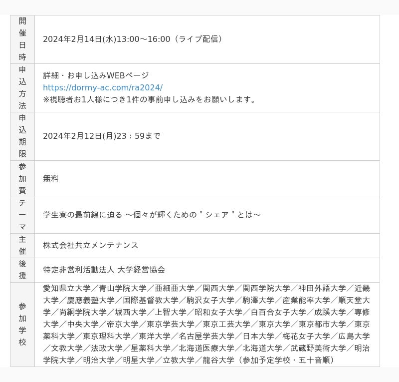 全国で約1,300校の学校法人と提携し学生寮を展開する株式会社共立メンテナンス(以下、共立メンテナンス/代表取締役社長:中村幸治/本社:東京都千代田区)は、全国のドーミーシリーズに暮らす44大学49寮の現役RA(レジデント・アシスタント)が理想の寮の実現に向けて日々取り組んでいる活動について発表を行う「第9回RAサミット2024」を、2024年2月14日(水)にライブ配信にて開催いたします。