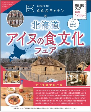 JTBグループで旅行 ・ライフスタイル情報を提供する株式会社JTBパブリッシング(東京都江東区、代表取締役社長執行役員:盛崎宏行)は、直営飲食店舗『るるぶキッチン』において、2024年1月25日(木)から2月18日(日)までの期間限定で、「るるぶキッチン×北海道アイヌの食文化」特集フェアを実施します。