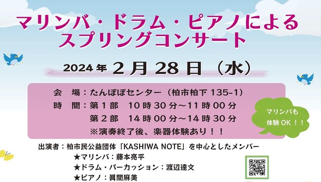 【入場無料】\『マリンバ・ドラム・ピアノによるスプリングコンサート』2月28日(水)開催/ in たんぽぽセンター