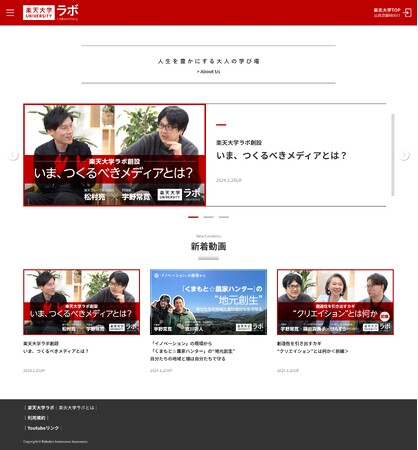 楽天グループ株式会社(以下「楽天」)は、インターネット・ショッピングモール「楽天市場」の出店店舗向けにEコマースのノウハウを提供する学習ポータルサイト「楽天大学」内に、次代を担うビジネスパーソンを対象に、幅広い領域の知識・教養を横断的に発信するウェブメディア「楽天大学ラボ」を、本日開設しました。なお本メディアは、「楽天市場」の出店店舗以外のユーザーも無料で閲覧することが可能です。