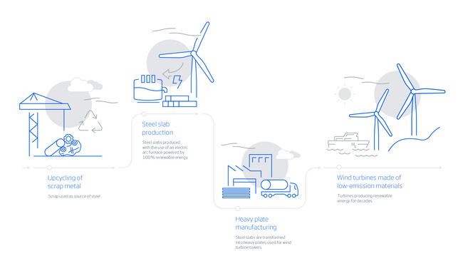 低排出スチールは、ベルギーのインダスティール・シャルルロワにあるアルセロールミタルの製鋼所で、動力源を100%風力エネルギーとする電気アーク炉で溶融したスチールスクラップを100%使用して製造されます。スチールスラブはその後、スペインのヒホンにあるアルセロールミタルの厚板工場で、風力タービンタワーの製造に使用される重量鋼板に加工されます。低排出スチールで作られたこれらの重量鋼板は、当初は陸上風力タービンタワー全体と洋上風力タービンタワーの上部への使用に適しています。低排出厚板鋼は、独立機関によって認証された環境製品宣言(EPD)を取得し、製品の完全な環境フットプリントが詳細に記載されており、製品間の比較が容易になります。