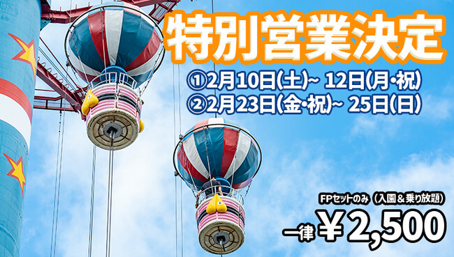 藤和那須リゾート株式会社(栃木県那須町/代表取締役社長:岩本 大二郎)が運営する“那須ハイランドパーク”では、2024年2月10日(月)~12日(月・祝)、23日(金・祝)~25日(日)の期間中、一部遊具限定で特別営業の実施が決定しました。当日はファンタジーパスセット(入園&乗り放題)のみの販売となり、通常価格より最大41%OFF(大人料金の場合)と超お得価格となります。この冬は、那須ハイをお得に楽しもう!