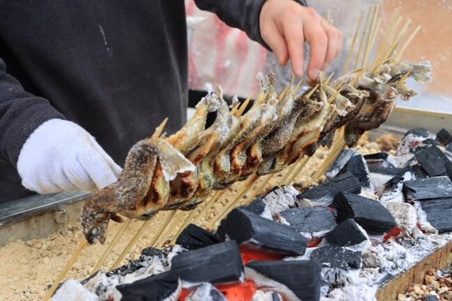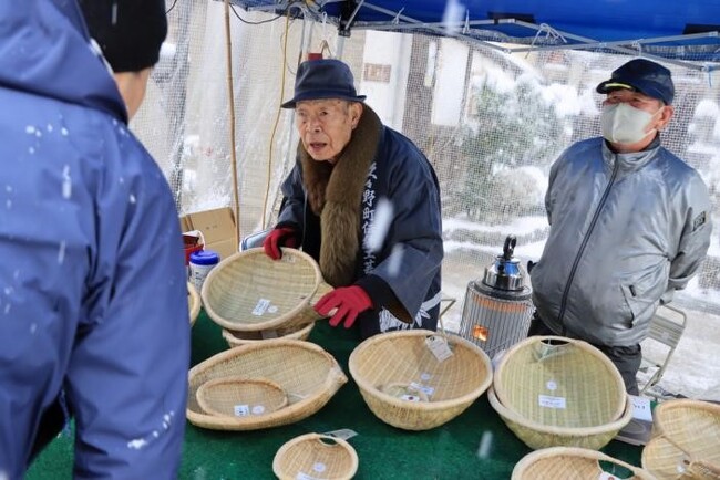 昼過ぎから吹雪となって客足は少し遠のいたようでしたが、本町通り商店街と安川通り商店街の合わせて約900メートルにわたって、軽食や木工品などを販売する露店81店が並び、竹を編んだ「小屋名しょうけ」と呼ばれるざるや、朴ノ木を削って作った「有道しゃくし」、薄く切ったヒノキやイチイを編んで作った「宮笠」などの昔ながらの民芸品などが販売され、朝から多くの買い物客で賑わいました。