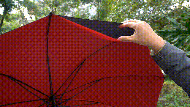 この傘は撥水加工した傘布を使用しています。使用後は軽くふるだけで雨粒を弾き飛ばすので、傘を閉じたあとに地面を濡らしにくて乾きやすい特徴があります。