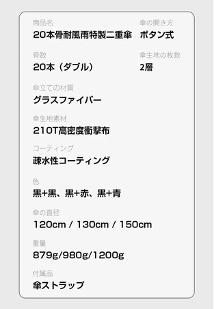 前回、Makuakeにて大好評で先行販売が終了した「強力な傘骨16本、超大型140cmの折りたたみ傘」から、新たに「折れる心配のない超強力20本骨の超耐風・超大型傘」が誕生しました。