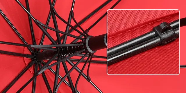 ダブルフレーム構造のこちらの傘は、約2倍の耐風圧があり、安定性が高く吹き飛ばされにくいで特徴があります。素材は、軽量で高強度、靭性が高く、錆びにくて耐久性のあるグラスファイバーを採用しました。強風や大雨の時にも安心感を持ってご使用いただけます。