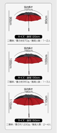 絶対に濡れたくない、いざという時に安心して使える超大型で、150cmくらいの方同士であれば4人くらいでも余裕の広さがあります。毎日の雨対策や、家族でのお出かけ、車内の置き傘に、お客様のご案内用の傘としても最適です。