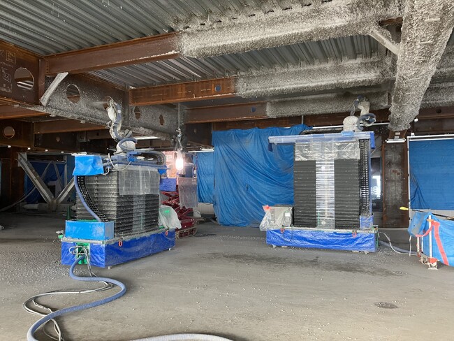 当社は、2019年に耐火被覆吹付けロボット(初号機)を開発し、中高層オフィスビルを中心に複数の建設現場で使用しています。耐火被覆吹付けロボットの、安定した施工品質(施工管理基準値を満たす被覆厚さおよび比重)を担保した上での施工歩掛り(1日あたりの吹付け面積)は、吹付け技能工による作業と概ね同程度であり、導入による省人化は、施工技能者不足を解決する一助となっています。