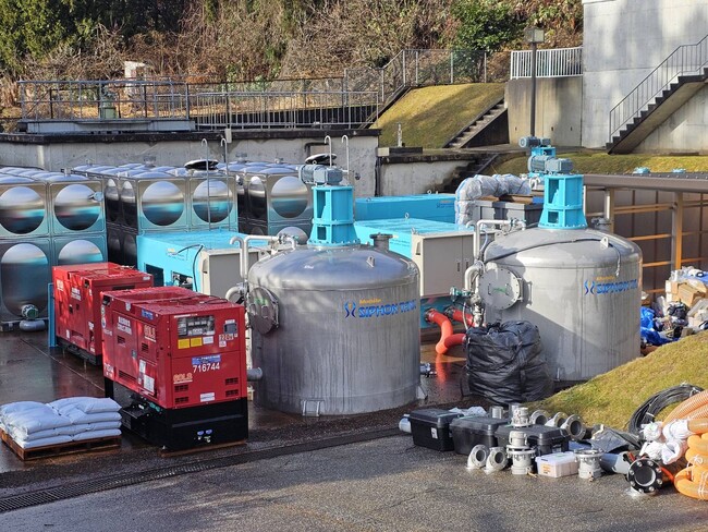 珠洲市では、名古屋市上下水道局が応援部隊を派遣して復旧支援を進めており、2系統のうち1系統が使用不能になった宝立浄水場内に3基の可搬型浄水装置「モバイルシフォンタンク(MST-2300SH)」を設置して、水道基準に適合した日量3,000立方メートル(m3)の水道水を供給する体制を整えました。
