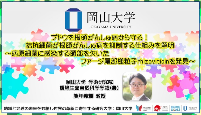 国立大学法人岡山大学(本部:岡山市北区、学長:那須保友)大学院環境生命科学研究科の石井智也大学院生(当時)、齋藤晶大学院生(当時)、Niarsi Merry Hemelda大学院生(博士後期課程3年)、農学部の土田菜月学部生(当時)、大学院環境生命自然科学研究科の包継源大学院生(博士後期課程1年)、学術研究院環境生命自然科学学域(農)の渡邉恵非常勤研究員(当時)、能年義輝教授と農研機構西日本農業研究センターの川口章上級研究員、理化学研究所環境資源科学研究センターの佐藤繭子技師、豊岡公徳上級技師、石濱伸明研究員、白須賢副センター長、九州大学大学院医学研究院の林哲也教授らの共同研究グループは、ブドウの重要病害である根頭がんしゅ病を抑制できる拮抗細菌が、頭部を欠いたファージ尾部様粒子によって根頭がんしゅ病の病原細菌を溶菌することで防除能を発揮する仕組みを明らかにしました。