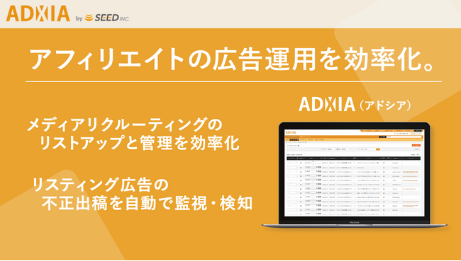 株式会社シード(本社:東京都千代田区、代表取締役:池田智之)は、アフィリエイトサイトのリストアップと管理を行う「メディアリクルーティング機能」と、リスティング広告の不正出稿を検知する「リスティング違反チェック機能」を有するアフィリエイト広告運用の効率化を目的としたSaaS型マーケティング支援ツール「ADXIA(アドシア)」をリリースいたしました。