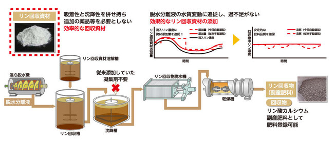 本施設は、2023年2月に国土交通省の下水道革新的技術実証事業(B-DASHプロジェクト)*1に採択された「新たなリン回収システムによる下水道の資源化に関する実証研究」を行う施設で、リン回収資材を用いて、下水汚泥脱水分離液*2から効率よくリンを回収し、安定的なリン資源とすることで下水道が持つ資源を有効利用するものです。