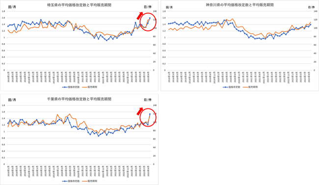 表6は、神奈川県、埼玉県、千葉県の平均価格改定数と平均販売期間の推移を表しています。いずれも東京都と同様の波形を示していますが、特に埼玉県、千葉県はここ最近、平均価格改定数と平均販売期間ともに顕著な増加が見られ、より取引姿勢の軟化が想定されます。